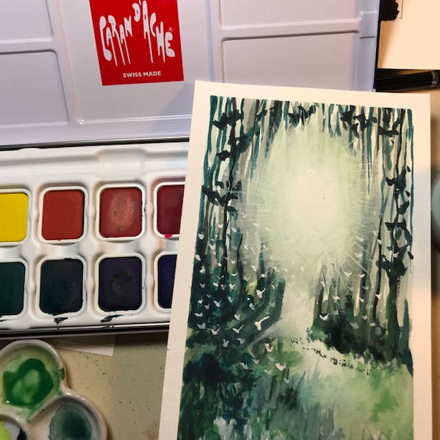 I have been eager to try gouache paints. I’d never even heard of them before this year… a 600 year old medium, kind of a marriage of watercolor and acrylic in behavior. Can be watered down and flow together like watercolor, can be used light on top of dark like acrylic, can be built up in heavy strokes like oil… Maybe the best of both worlds? I found this set of caran d’ache gouache pans, the only pan set I could find… They remind me of tempera paints, and even say poster paints in one place. A kind of chalky finish of the final product I’m not crazy about. I can see the benefit to using tubes instead of pans, and being able to use thicker paint. It was strange after all this time learning to leave white spaces white, to now add them in with paint… I don’t know if I liked it or not!