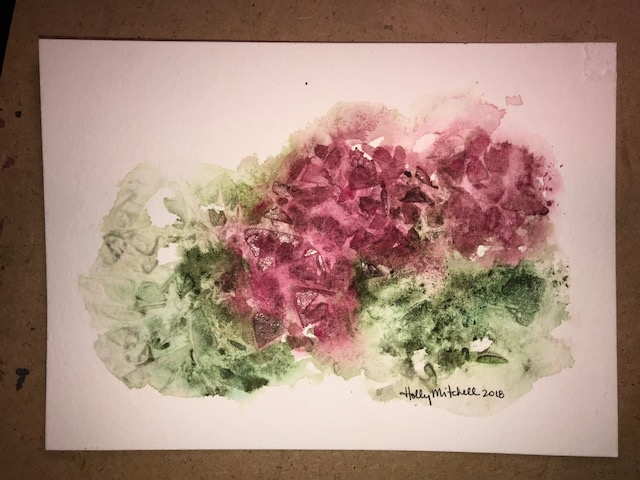 This time I used mostly Daniel Smith Green Apatite Genuine (amazing granulation), Undersea Green, Quinacridone Rose, and Schmincke Potter’s Pink. I wish I had used something deeper than the Rose. I have some Schmincke colors I think I would have liked better.
