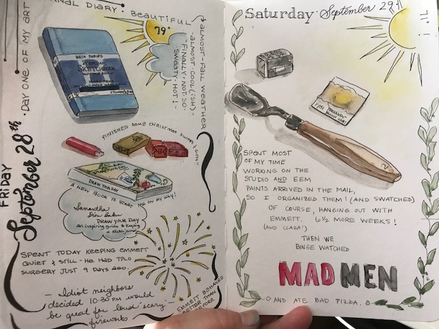 My style is similar to hers, and I love drawing mundane every day items. She helped me to see that drawing simple anythings or nothings has value as much as creating something special to sell or exhibit. I loved the idea I found two months ago about drawing a doodle each day about the day in my calendar, but this is even better. I’m excited to start journaling my days without feeling like I need to write things out, unless I want to. I am not committing to doing this every single day, and won’t let myself feel GUILTY when I don’t, but it is relaxing, it is great practice, and I plan to try as many evenings as realistically possible. Here is what I’ve done so far: