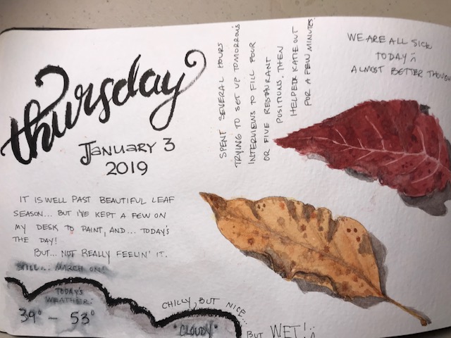 I had planned to fill both pages with watercolor leaves, and frankly just wasn’t feeling it. So… Mira Byler suggested this in the youtube video I watched tonight. She tried it with ink first, which didn’t take to the leaves well, so I tried watercolor. Both had marginal success. She’s right, the gouache works better. Basically, a lazy artist’s page, but I’m sticking with the idea that I was EXPERIMENTING. Anyway, slapping gouache onto leaves is relaxing and fun.