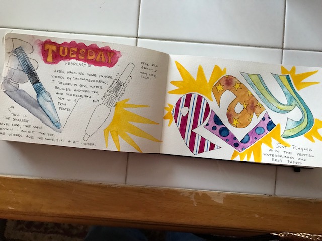 But I recognize that water brushes can be extremely convenient when you don’t want to use cups of water, for example in an airplane, a deli, on location really anywhere. Or even in your own studio. Sometimes it is just simpler not to use a cup of water. Honestly… sometimes I am too darn lazy to go find clean water. A filled water brush makes me happy then. I follow several artists on youtube who swear by them. These Pentel brushes are easier to use than some I’ve tried in the past. Or really, maybe they just seem easier to me because “Meow Meow Kapow” on youtube told me they were. It’s hard to be sure. But I do like them and am having fun playing. I’ll see if I can get the hang of them over the next few days.