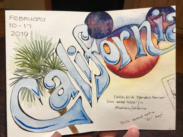 I purchased this 4×6 Pentalic Accordion Fold Dream Catcher Watercolor sketch book January 6th, for $7.99. I was afraid to start it! I’d seen a youtube artist, Drawing Wiff Waffles, do a very cute scene in it, and just couldn’t think how to use it. In the end, it fit PERFECTLY inside the tiny zipper bag I wanted to take for my art supplies on my trip to California recently. AND, it had exactly the right number of double pages, using both front and back, for a title page, and one double page per day! (I included the Amazon link for the book, but there’s also a drawing book instead of watercolor book, if you prefer. The regular pentalic watercolor journals are very nice, too!)