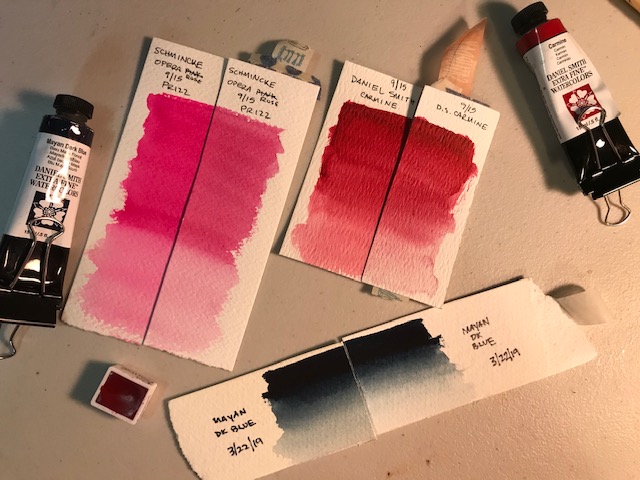 In September of 2018, in an effort to calm my fears about lightfastness once and for all, I made a little swatch of my only opera (Schmincke’s opera rose… a brand I certainly trust), and another swatch of Carmine (Daniel Smith, another great company… this is the pink/red I was using at the time, only because I received two free tubes of it, and liked it fine.)