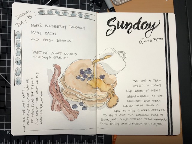 Sundays rock. The scent of maple syrup and bacon spreading through the house is just The Best AM gift. It lured me out of the studio and began a day of both work and relaxation. We spent the day at a team meeting, dinner with some of our kids, then home, and I forgot to journal until just before bed! So, a quick pancake sketch.