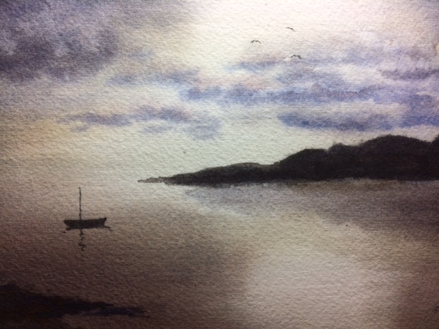 I tried a cheap acrylic brush for this first one because I didn’t have the hake brush he used, but it absolutely didn’t work. Left stripes everywhere. It is very stiff and bristly feeling and (turns out, after a moment’s research) the hake is very soft.  The mountains are supposed to have three layers so you see distance, but the first layer was too wet and bled too much. The second layer too dark, so the third also too dark. I like the way he lifted a tiny sail out of the paint on the mountains to show boats in front of them. The rocks in the bottom right worked better today that yesterday. But not like his. They were scraped away with a bit of plastic gift card.