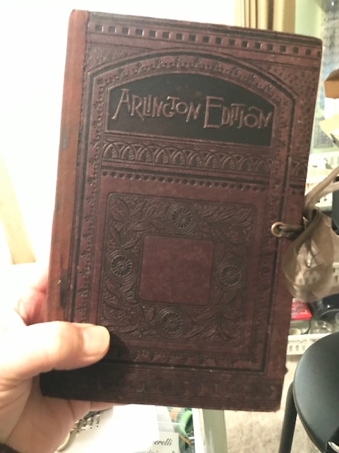 Step one: I had a very old, but damaged, copy of Robert Burns poetry. VERY old. Beautiful. BUT DAMAGED. Please remember that. (I know some of you don’t like people tearing up books for art, which I frequently do.) So, following “Nik”‘s directions, using an exact knife, I removed the pages from the book, being careful to keep the cover completely intact. (You don’t have to use a book cover. You can use heavyweight paper, cardstock, and Following the White Rabbit shows how to make it without a cover at all!)