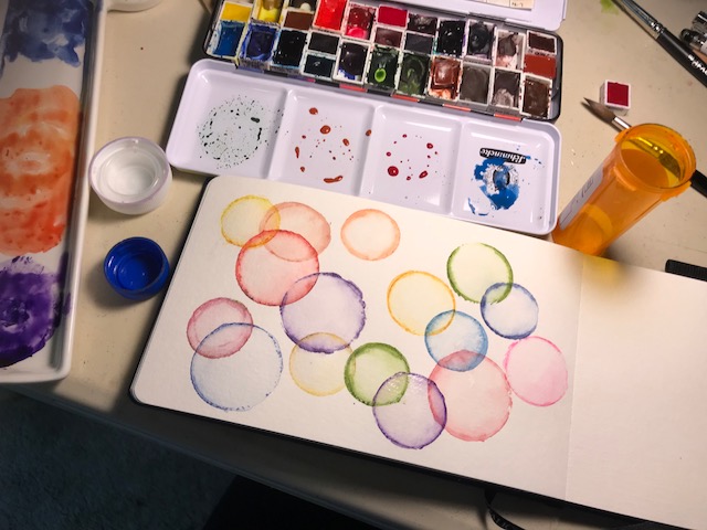watercolor paper, brush, paint, palette, water, and some random sized bottle tops.