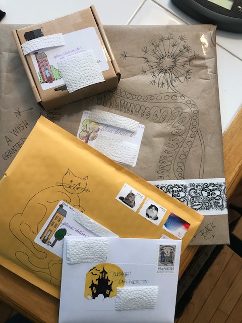 Getting my mail ready to go out always takes longer than I think it will… no such thing as a plain boring letter! So I’m counting my five address labels as today’s art project. (I tried to match them to the theme of what was inside, where I could.)