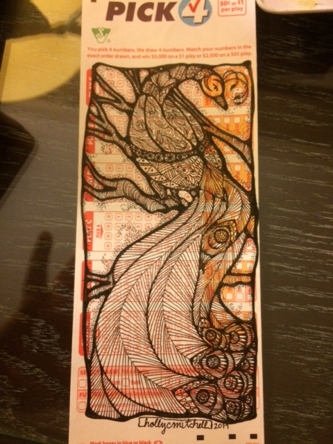 I don’t exactly “zentangle“, but I do like to draw these sort of zentangled pictures. We are on a business trip but I won’t let that stall my threesixfive project. (Plus I love my art supplies like they are children. Almost. So brought a bunch with me. A mini travel version of my studio.) I did this project on the plane, on an empty lottery ticket I picked up at Food Lion. I wish I had thought to work the shaded areas into the design. And I thought of a way to work the feathers in better. But I’m needing a pencil on fewer and fewer projects, which feels like improvement.