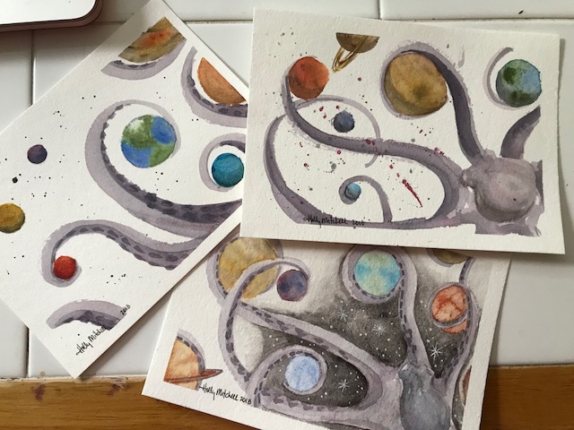 It turns out, staring at a blank canvas bag which will end up with someone I don’t know is rather daunting!! I don’t want to paint something she hates. I peeked at her profile to get some ideas, and saw “cephalopods” on her list of “likes”… I’m not sure how the planets came into being, I just thought they’d be kinda cool. So I ended up with an octopus either orchestrating, designing, or destroying the universe, depending upon your point of view, and current mood. 🙂 Or really, maybe just playing around with it.