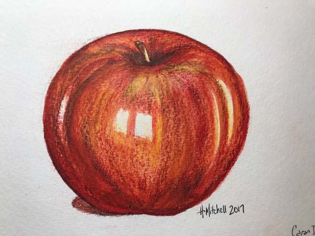 Not thrilled that I’d lost a bit of lighter colored area I had left on the top of the apple, I tried pulling some color up by erasing… perfect! It removed just the right amount. I’ve read that I can also rewet it and lift color just like watercolor paint.