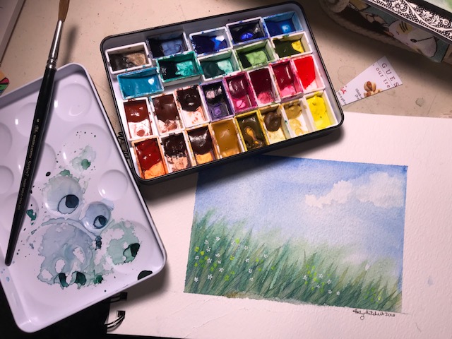 I’m using Qor paints, and also these Daniel Smith watercolors… I love all three of these colors, particularly the Undersea Green. Mixed with just a touch of Daniel Smith’s sap green it is really extraordinary in my opinion, and I love it in those trees. The Undersea Green with just the tiniest touch of Qor Manganese Blue (which I purchased at Jerry’s Artarama in town nearby, because I couldn’t find it on Amazon :), makes the blooming grassy area in this treehouse… I turned the paper upside down and let gravity help. (a little hint… painting on an easel makes a big difference!) And the sky is the Qor Manganese Blue.