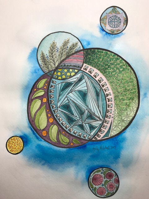 So Monday, after working, I came home and simply did not want to paint or draw or anything else. So I just wrote “Monday”. When I filled the background in with lines I was going to add a little color… and the ink I had used bled! Naturally (was my thought at the time) I added a little shiny gold “hello” just to show Monday it hadn’t beaten me.