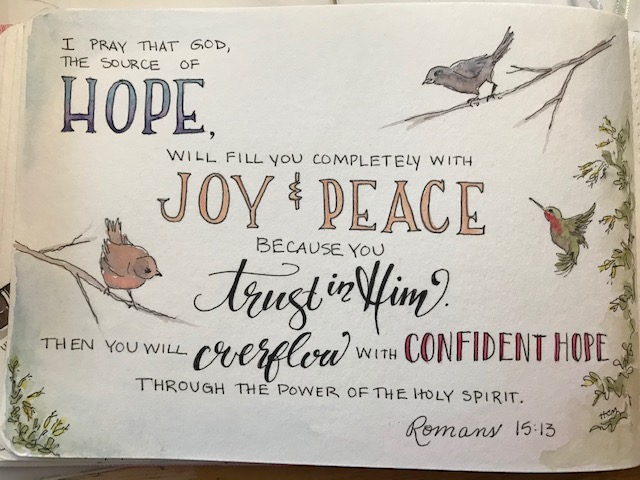 This was my entry for last Wednesday. Mandy-of-above-mentioned-channel and I decided to do a little Bible journaling. I didn’t do it in a Bible, though. I will tell you it DID lower my anxiety level, as I kept turning this verse and what it means over and over in my mind as I created my page.